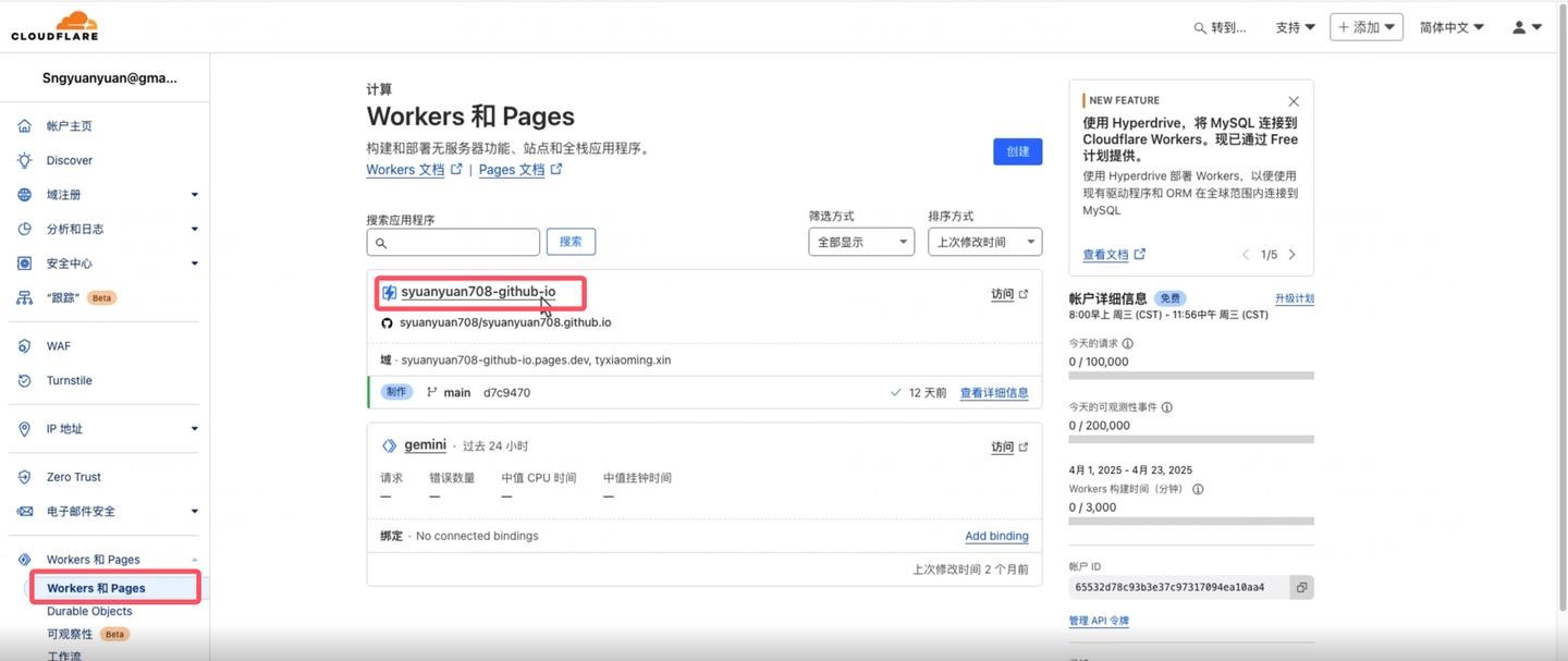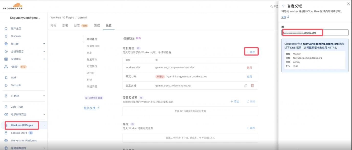 对于 Cloudflare Workers 配置自定义域,操作与之前保持一致。进入您的 Workers 服务,选择您的 Worker 项目,点击“设置”(Settings)。找到“添加域和路由”(Add domain and route) 选项,选择自定义域,输入您的域名,点击添加,等待其生效即可。