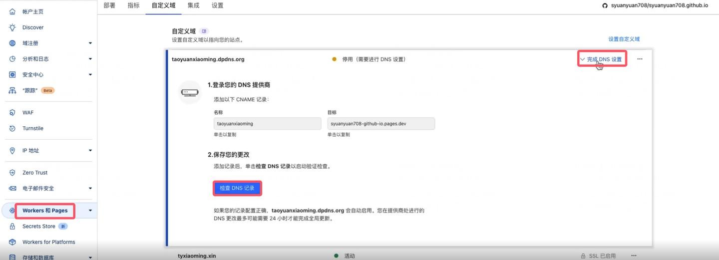 保存 DNS 记录后,回到您的 Pages 项目的自定义域设置页面,点击“完成 DNS 设置”,再点击“检查 DNS 记录”。耐心等待一段时间,直到自定义域的状态显示为完全生效即可。