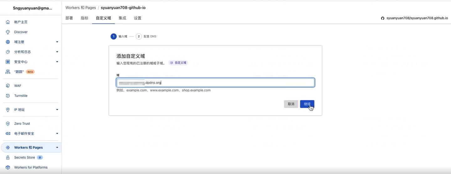 首先看 Cloudflare Pages。回到 Cloudflare 账户主页,进入 Workers & Pages 服务,选择您的 Pages 项目,点击“自定义域”(Custom domains)。点击“设置自定义域”,粘贴您注册的域名,点击继续。