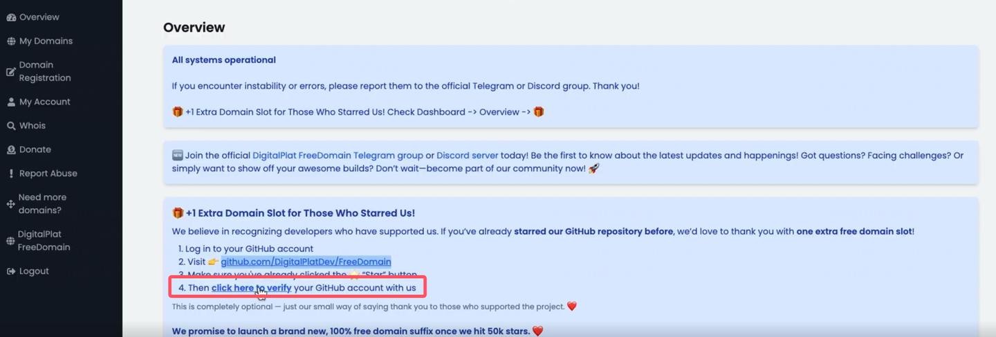 打开 DigitalPlat 的 GitHub 项目页面,点击右上角的 Star 按钮。回到 DigitalPlat 控制台,点击旁边的“验证”按钮。验证成功后,刷新一下网页,您会发现免费域名额度已经增加到了两个!