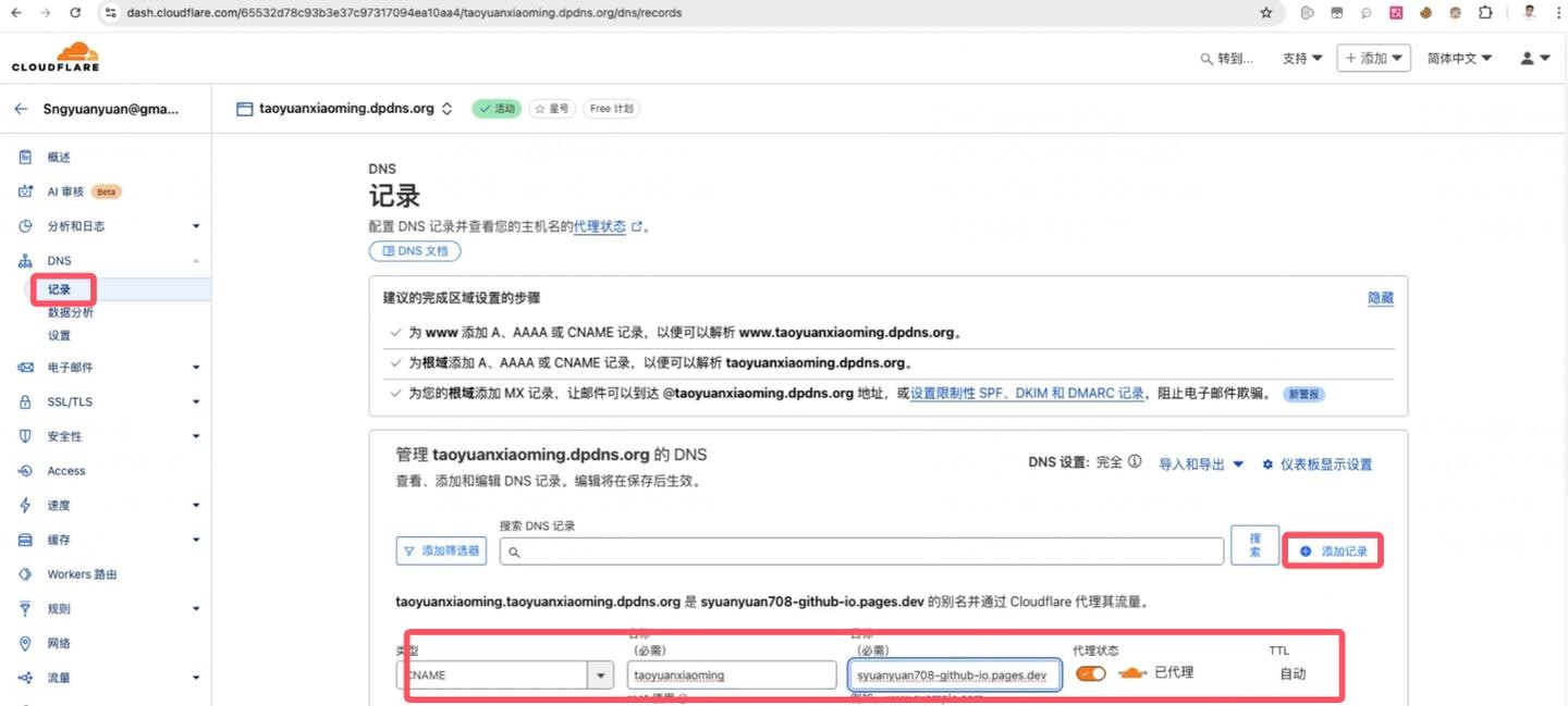 点击右下角的“稍后完成 DNS 设置”,回到 Cloudflare 账户主页,进入您的域名的 DNS 记录管理页面。点击“添加记录”(Add record),选择 CNAME 类型,将之前复制的源域名和目标域名分别粘贴到对应的字段中。请确保记录旁边的小黄云(Proxy status)处于开启状态,然后点击保存。