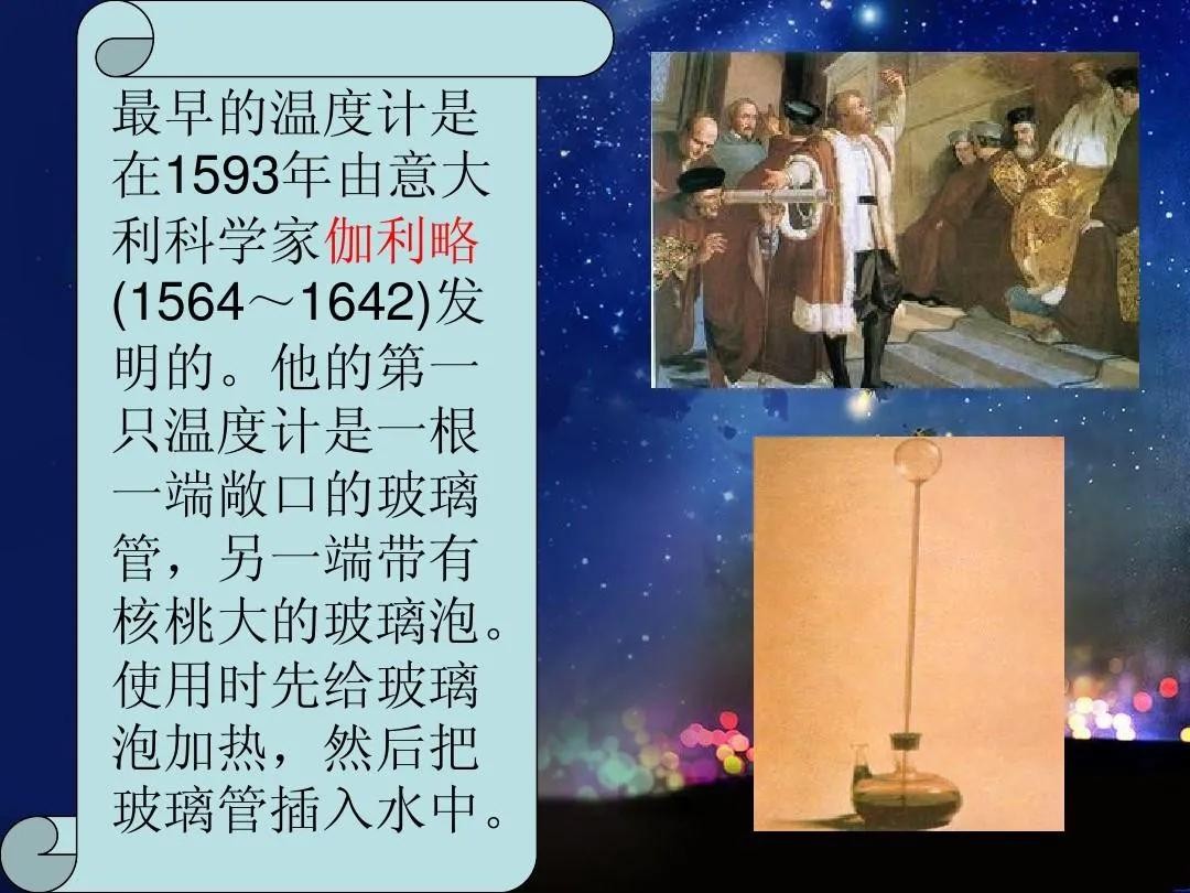 伽利略在温度计的发明上也做出了重要贡献。他设计了一种早期的温度计,利用水和空气的温度变化来测量温度。这一发明虽然简单,但却为后来的温度测量技术发展提供了启示。伽利略的温度计采用了液体膨胀的原理,成为现代温度计的前身之一。