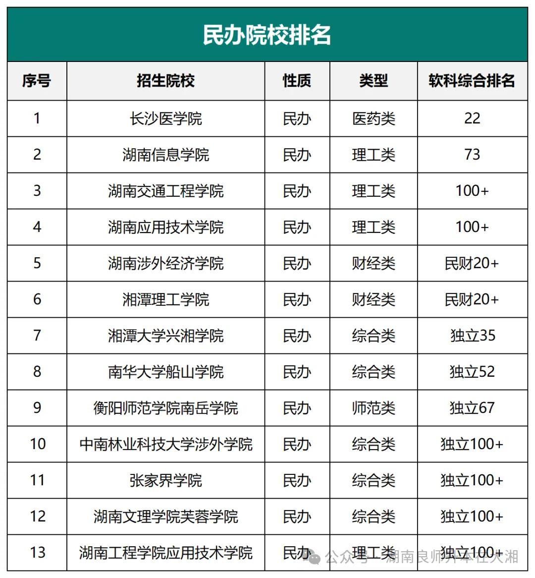 长沙医学院(国内排名22)和湖南信息学院(国内排名73)在国内软科民办院校综合排名中位居前列。