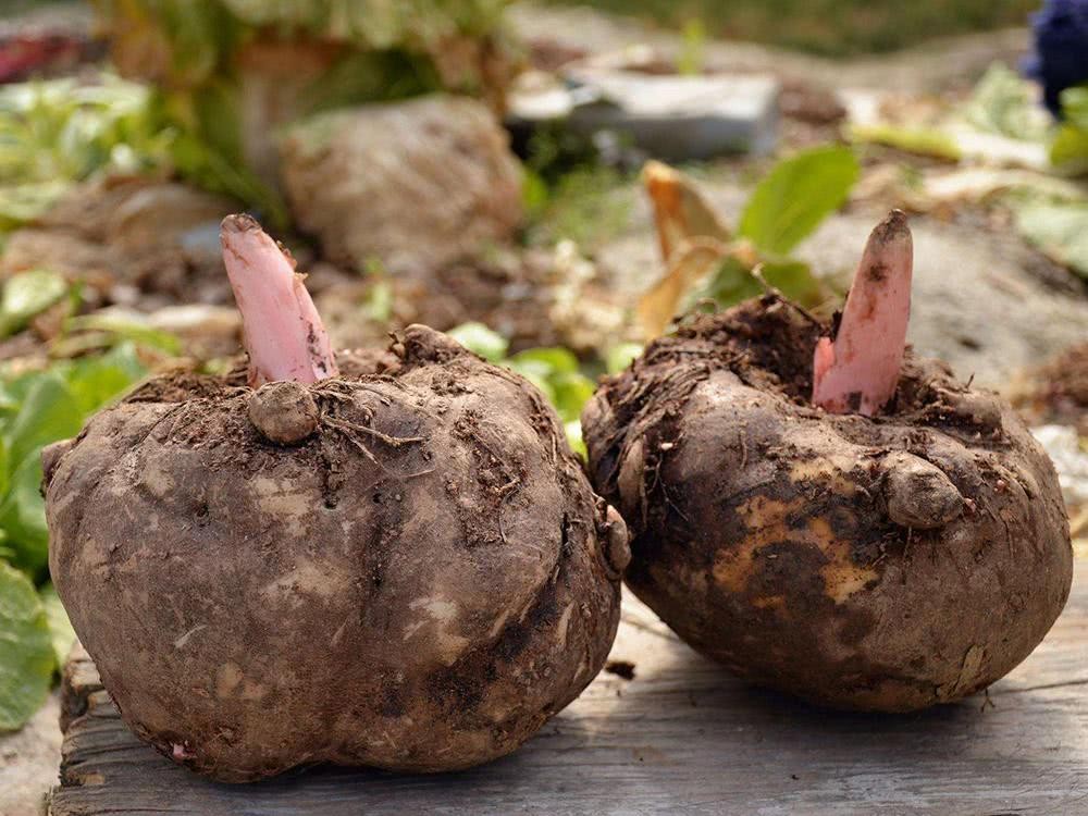 魔芋的地下块茎呈球形,长得蛮好看的,在小吴家乡现在卖8元一斤,到了年底很多的人买 回去制作魔芋豆腐来吃。
