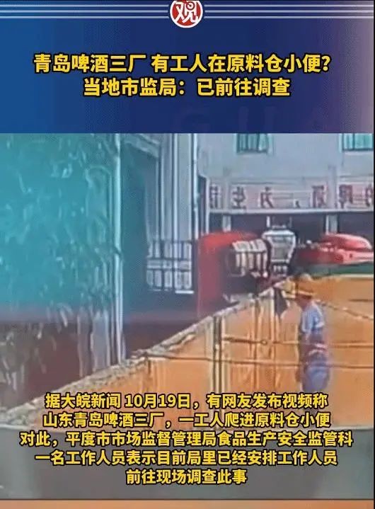 然而,今年的青岛啤酒并不仅仅是清爽的啤酒味道。最近,一段令人震惊的视频在社交媒体上传播,展示了青岛啤酒三厂的工人在原料仓撒尿的情景。这个事件不仅让人们对食品安全产生了疑虑,也对青岛啤酒的声誉造成了严重冲击。