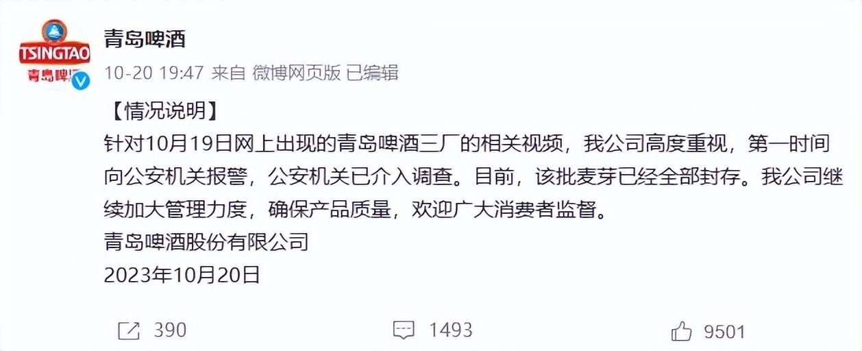 青岛啤酒公司在事件曝光第二日出面回应了事件。公司表示他们将封存这批麦芽,并已经寻求警方介入调查。这个回应得到了许多粉丝的支持,他们认为这一切是一场阴谋,有人在幕后操控、嫁祸良心国货。公司的回应一定程度上缓解了公众的担忧,但问题的核心仍然没有得到解决。