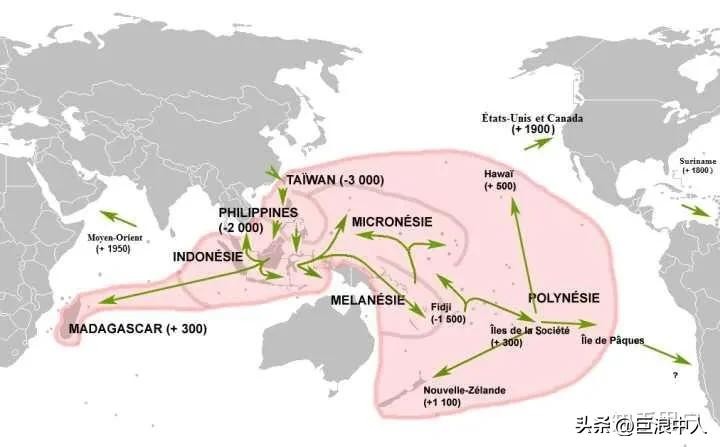 大坌坑文化的先民在台湾定居以后,一部分人转到台湾全岛各地,因而发展出了今日多样的台湾原住民文化。另有一部分人则开始展开海上冒险,最先是南下到菲律宾群岛,接着,又分成两路。一条路线往东,到达俾斯麦群岛、所罗门群岛,马利安那群岛,再到萨摩亚群岛、波利尼西亚群岛。最北到达夏威夷,最东到达复活节岛,最南到达新西兰,成为毛利族人的祖先。另一条路线往西,到达婆罗洲、马来群岛、爪哇、苏门答腊,又横渡印度洋,最远到达马达加斯加岛。