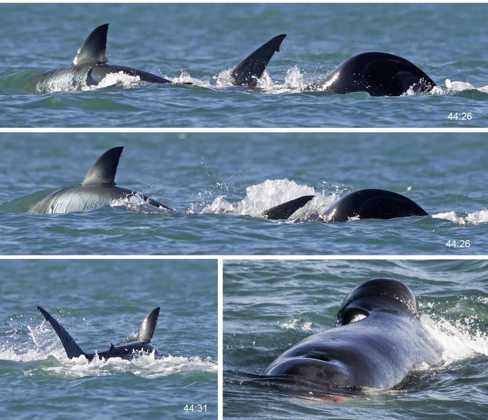 它们一起狩猎大白鲨,最初的原因可能就是海洋中缺少它们正常的捕食对象。