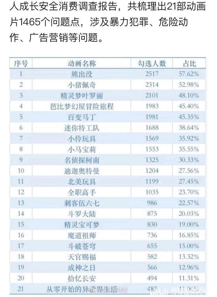 据今天四月份江苏消保委关于动画领域侵害未成年人成长安全消费调查报告所述,21部动画片发现1465个问题点。很多知名动画《熊出没》,《小猪佩奇》《精灵梦叶罗丽》等热播的动画也名列其中。