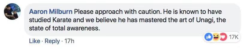 “请谨慎接触该嫌犯,因为他会空手道,掌握了Unagi的神技。警告公众远离这名嫌犯。”