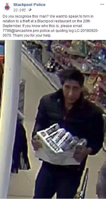 两天前,英国布莱克浦(Blackpool)警方在社交网络上公布了正在通缉的一名涉嫌在当地餐馆偷窃啤酒的男子照片,并向民众呼吁,如果认出该男子,请及时与警方取得联系。