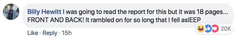 “我想读(警方)报告来着,但太长了……整整18页!正反面都有!屁话太多了我就睡着了……”