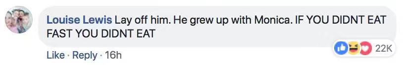 “放过他吧,他跟Monica一起长大,不抢着吃的话就没得吃了。”