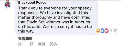 随后,英国布莱克浦警局也就此事做出回应:“非常感谢大家的及时反馈,我们已经对此事进行了彻查,并证实大卫·休默当天身在美国。对于该事件的不断发酵,我们深表歉意”。