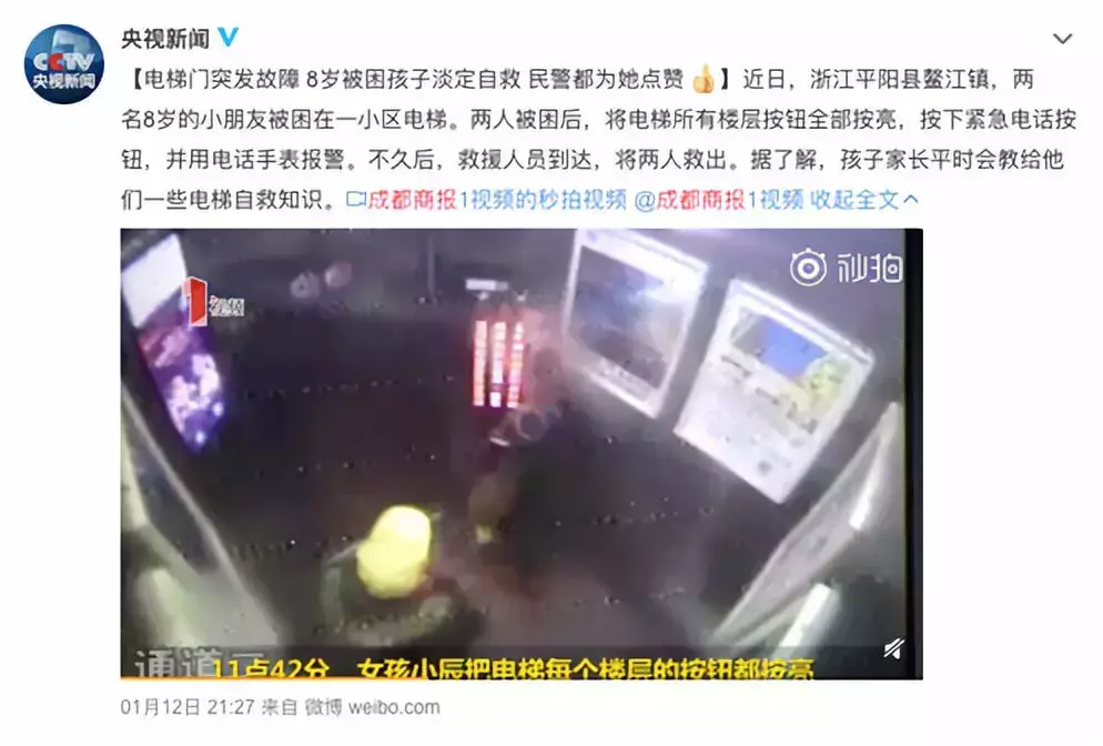 视频中,温州平阳县鳌江镇两位8岁的小朋友被困在小区电梯里后,不仅没有害怕,还“三招”自救。