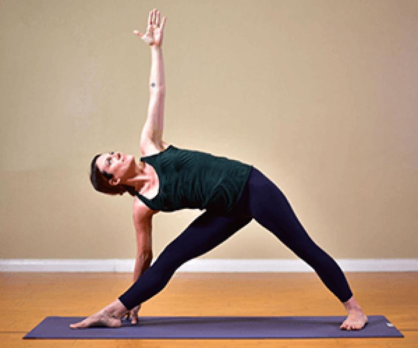 站立。右脚向外转 90 度角,左脚外缘与瑜伽垫的短边对齐。伸出右臂,同时向后和向下拉右臀部;骨盆向右倾斜。将右手放在右胫骨或胫骨外侧以保持稳定;左臂伸向天空。
