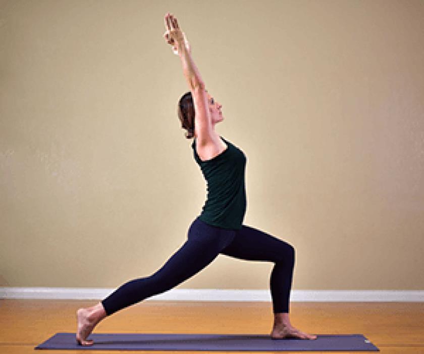 右脚向前进入弓步式,手臂伸过头顶,凝视前方,放松肩膀、脸部和眼睛。保持几次呼吸,然后换边练习。