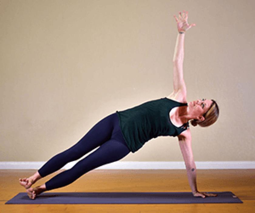 从下犬式开始,双脚并拢,脚后跟向右旋转,双脚叠放。将重心转移到右臂时,保持正确的肩部对齐。左手向上举起,