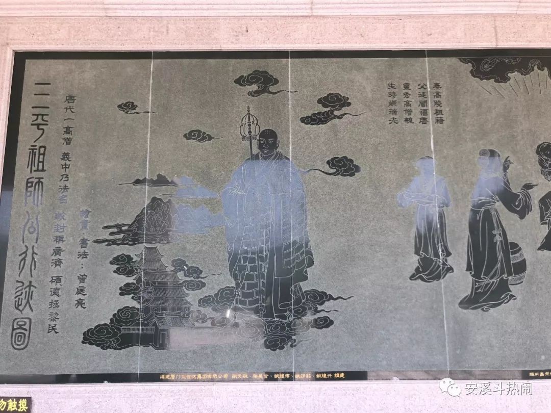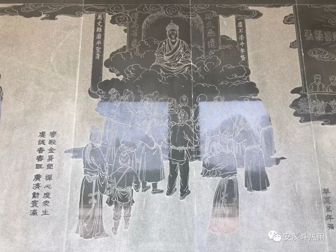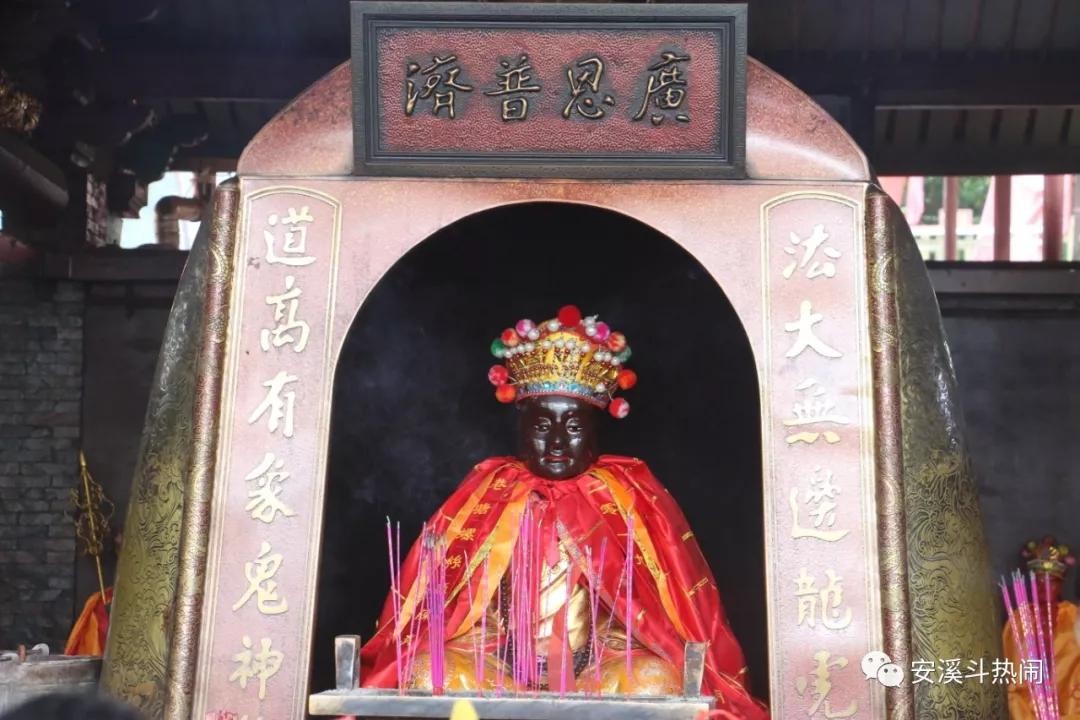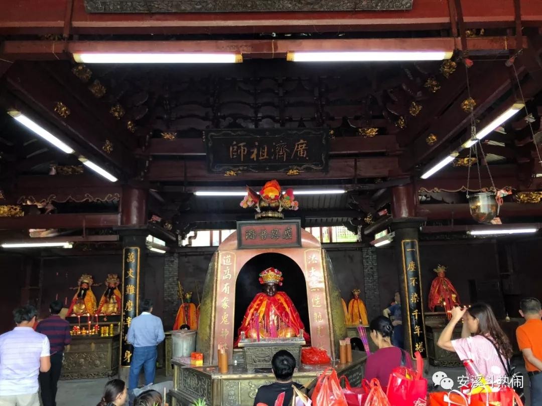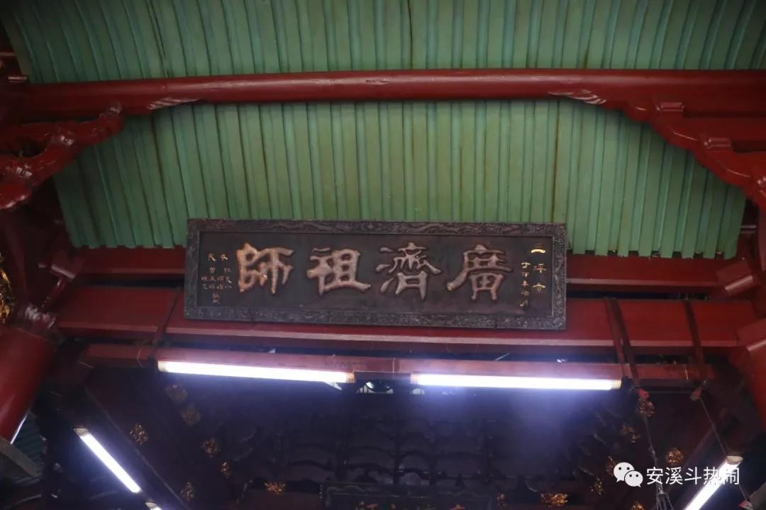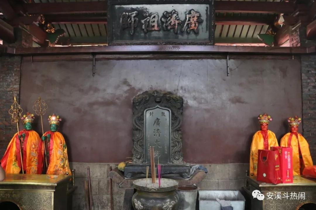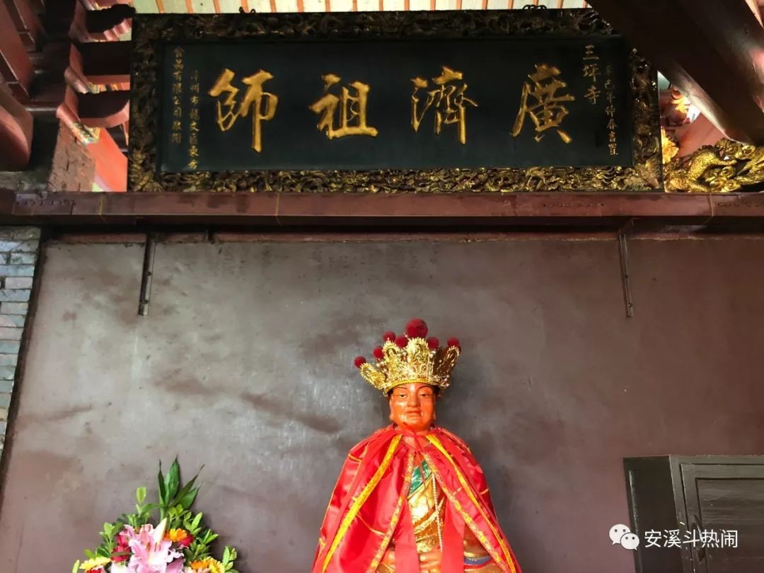 这里香火鼎盛,常常被挤得里三层外三层,人头攒动,水泄不进。这塔殿的正中,有一个圆伞形的顶盖,构造极为雅观别致,碑文称之为“宝盖”,正好罩在广济大师的头上。据传,义中大师九十二岁时,是坐着告辞人世间的,是三平寺最为热闹的地方。大边塑一尊义中大师像,小边则为潘颜尚书。殿壁两侧镶有七方碑碣,都是明、清重修殿宇的碑记。