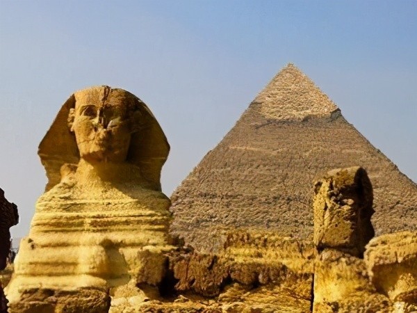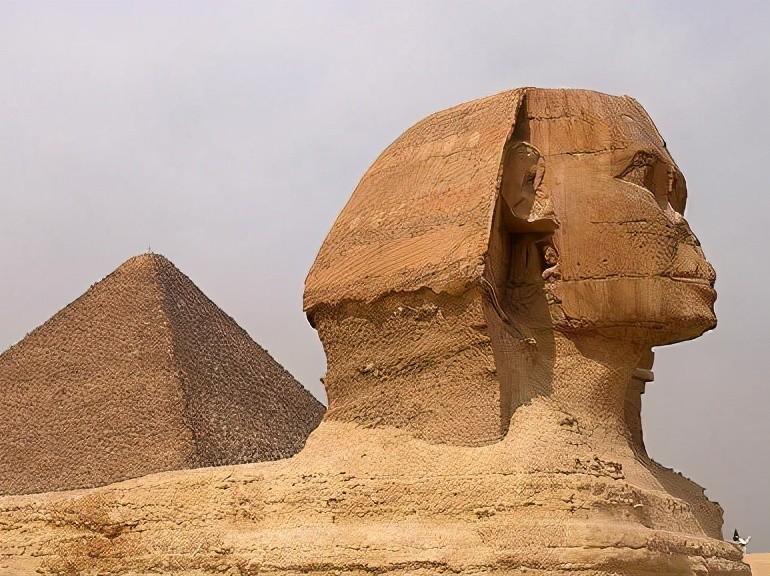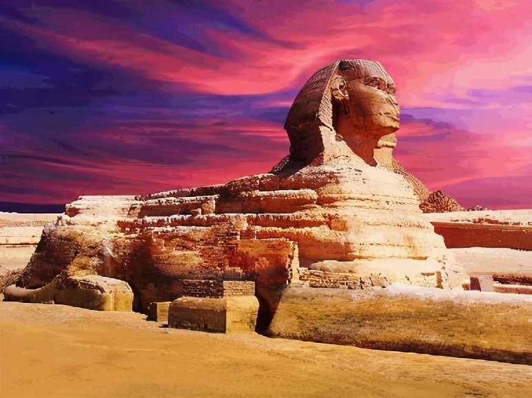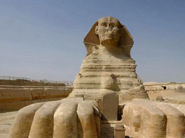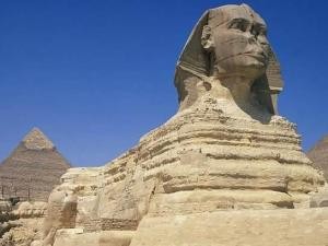 狮身人面像(又译“斯芬克斯”),坐落在开罗西南的吉萨大金字塔近旁,是埃及著名古迹,与金字塔同为古埃及文明最有代表性的遗迹。像高21米,长57米,耳朵就有2米长。除了前伸达15米的狮爪是用大石块镶砌外,整座像是在一块含有贝壳之类杂质的巨石上雕成。面部是古埃及第四王朝法老(即国王)哈夫拉的脸型。