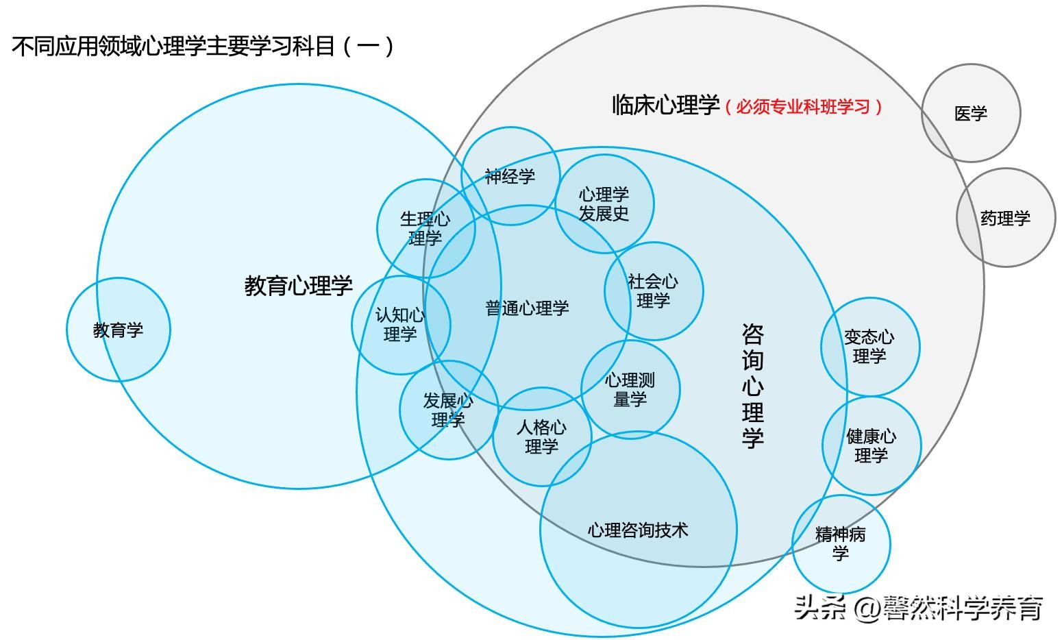 通过两个图的比较我们可以很清楚的知道:尽管心理学有很庞大的学科知识体系,但整体而言都建立在几个基础的学科底座上。无论要学习哪一个细分领域,这些底座都是必须学习的内容,包括: