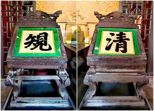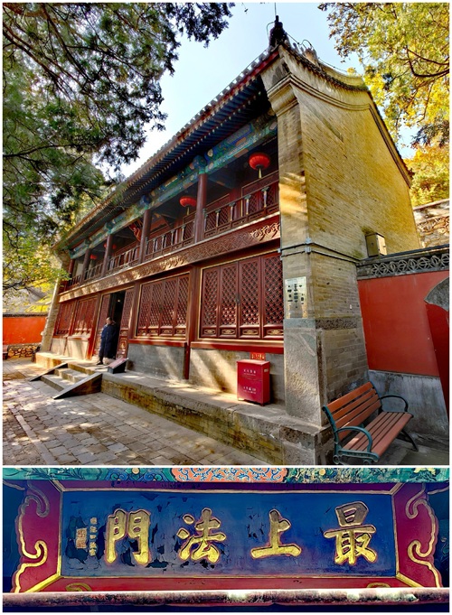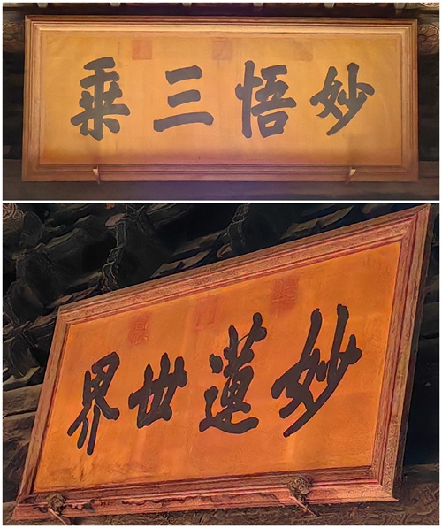 大殿内出入的门眉上方,有慈禧太后御笔题匾,上图为前门匾额“妙悟三乘”,下图为后门匾额“妙莲世界”。