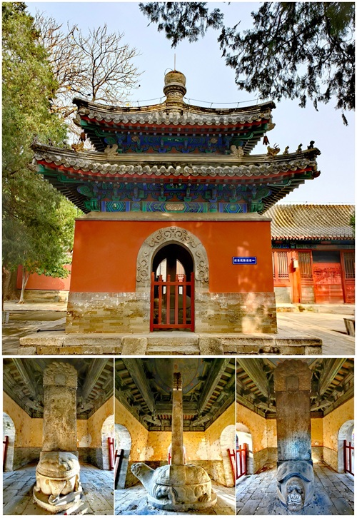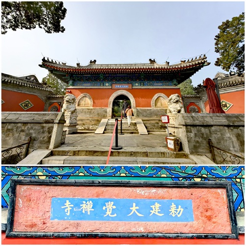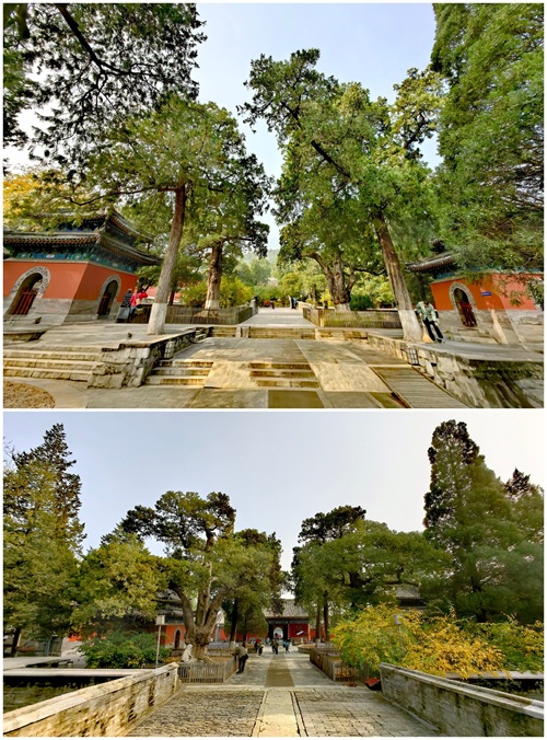 大觉寺第一进院落场景,下图为山门殿内侧。院落正殿为天王殿,东部两座碑亭,中部为放生池和功德桥,西部为钟楼和鼓楼。