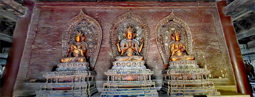 殿内主位供奉无量寿佛(即阿弥陀佛)坐像,左右两侧供奉观音菩萨和大势至菩萨立像,泥塑沥金,宝相庄严。无量寿佛、观音菩萨和大势至菩萨被称为“西方三圣”。