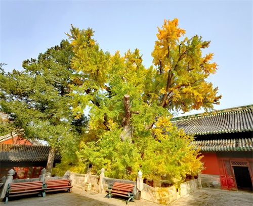 大殿前左右各有一株银杏树,北面的一株雄性银杏树,树高二十五米左右,树围达八米。相传是辽代所值,距今已有近千年历史,依旧枝繁叶茂,雄伟挺拔,被誉为“银杏树王”。