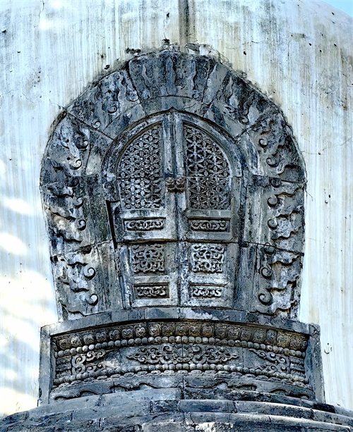 第五进院落,迦陵舍利塔始建于乾隆十二年(1747),是清雍正年间大觉寺主持迦陵禅师的墓塔。为一座佛教覆钵式白塔,砖石结构,高约十五米,塔基高五十厘米,呈四方形。塔座为八角形,正面朝东,上枋和下枋雕刻仰莲、覆莲,四周由祥龙、葵花、牡丹、莲花、西番莲等图案砖雕构成。塔身呈覆钵式,上宽下窄,正面有焰光式塔门,塔身上面有十三层相轮,最上面是华盖,上悬八个风铃。