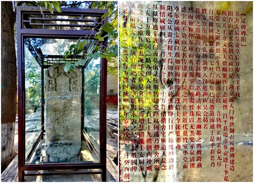 大悲坛北侧,立有镇寺之宝—辽碑。《阳台山清水院藏经记》辽代古碑,碑文记载了咸雍四年(1068)阳台山清水院(现称大觉寺)山下南安窠村(今南安河村)信士邓文贵出资30万修葺清水院僧舍,并募缘50万助印大藏经(契丹藏)579帙始末。辽碑后面的保护罩上印有译文。