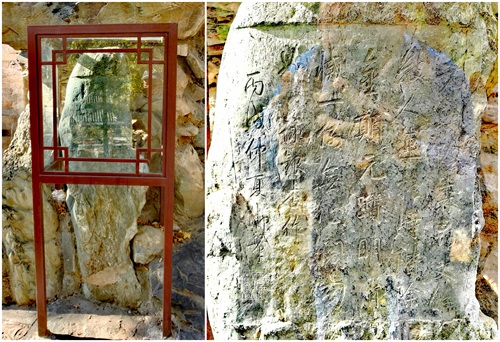 领要亭北侧立有乾隆皇帝御笔咏领要亭石刻,题领要亭。 清乾隆三十一年(1766) 四柱孤亭依碧山 飞流足底落孱顽 问余领妙于何处 袛在麦场禾垅间 丙戌仲夏夜题