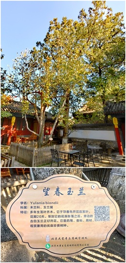 四宜堂院落里的白玉兰树,高十余米。相传为清雍正年间迦陵禅师亲手从四川移种,树龄有三百多年。古玉兰树冠庞大,为白色重瓣。每年清明前后绽放,持续至谷雨,其姿、色、香堪称京城玉兰之最。大觉寺的玉兰花、法源寺的丁香花、崇效寺的牡丹花并称京城三大花卉寺庙。