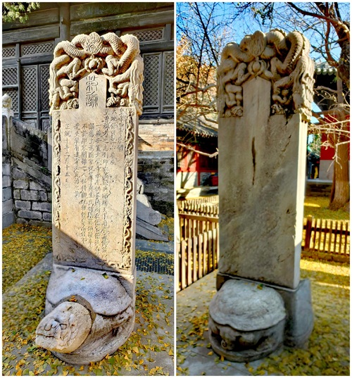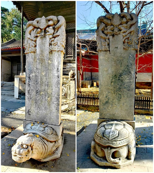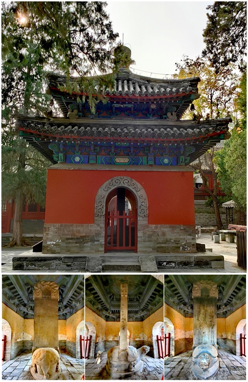 南碑亭,始建于明清时期,亭中立石碑一通,螭首龟趺,碑阳刻雍亲王撰送迦陵禅师安大觉方丈碑记,碑阴刻乾隆十二年御制重修大觉寺碑文。