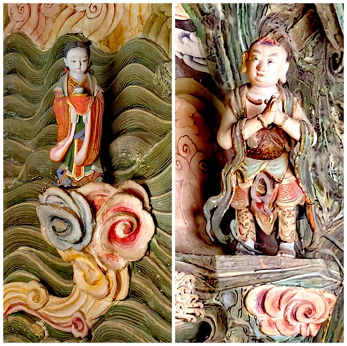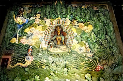 佛像板壁后有清代泥质悬塑,上塑海水江崖,观音坐于山海之中,称为“海岛观音”。
