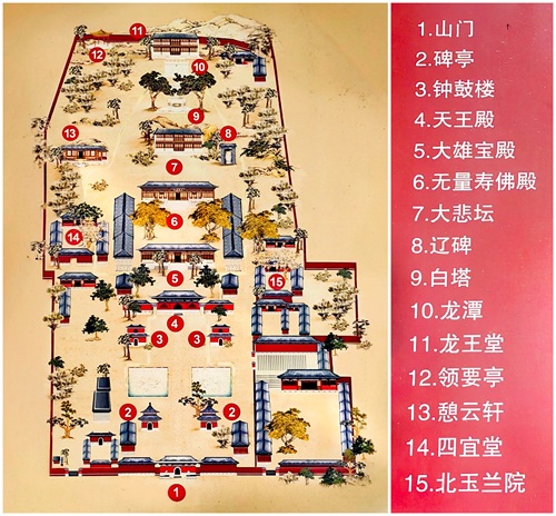大觉寺平面示意图。大觉寺建筑分中院、南院、北院三个院落。中轴线(中院)建有山门殿、碑亭、钟鼓楼、天王殿、大雄宝殿、无量寿佛殿、大悲坛、白塔、龙潭、龙王堂等建筑。南院为清代行宫院,建有戒台殿、四宜堂、憩云轩、游廊和领要亭等建筑。北院为僧人的居舍,有方丈院、香积厨、北玉兰院等建筑。