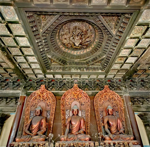 殿内主位供奉释迦穆尼佛,两侧位供奉东方药师佛、西方阿弥陀佛(现在的三世佛是1972年从智华寺移来的)。顶部井口是木制盘龙藻井。