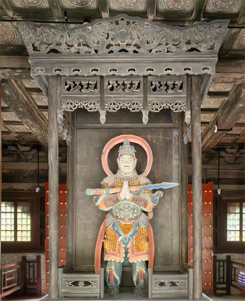天王殿为第一进院落正殿,面阔三间,进深五檩,歇山顶筒瓦屋面。殿内正位供奉弥勒佛,两侧位供奉四大天王塑像。