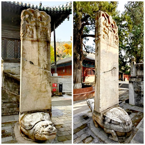 北碑亭,始建于明清时期,造型美观大方,亭中立石碑一通,螭首龟趺,碑阳刻明宣德三年御制重修大觉寺碑文,碑阴刻正统十一年御制重修大觉寺碑文。