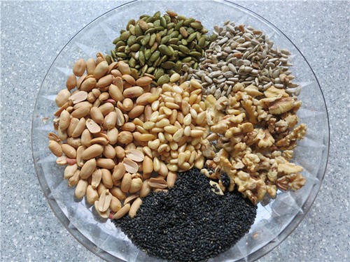 五仁馅:花生100克,核桃仁50克,葵花籽仁50克,杏仁40克,腰果40克,白芝麻10克 ,黑芝麻10克