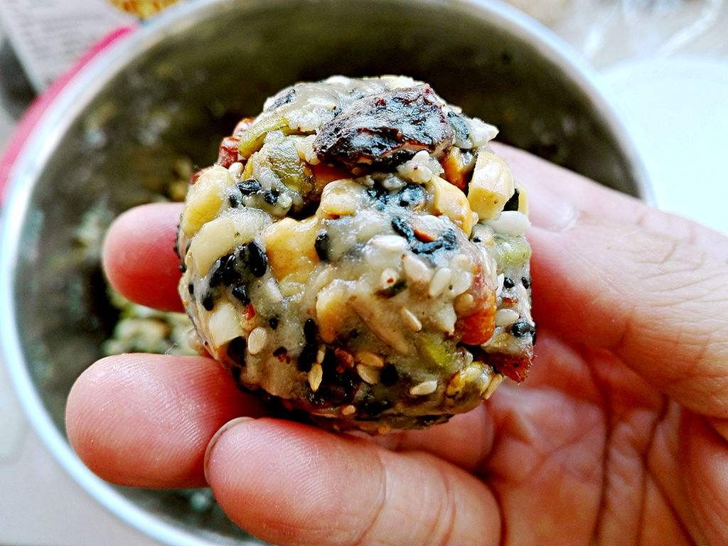 1.先把生的坚果食材放入锅里小火慢炒,炒香炒熟;糯米粉炒熟,备用(微微发黄即可)。