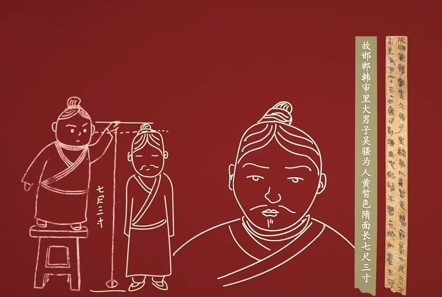 “故邯郸韩审里,大男子吴骚,为人黄皙色,隋面,长七尺三寸。”23个字介绍了一位来自原邯郸韩审里的男子,他叫吴骚,皮肤有些黄,椭圆的脸,身高一米七左右。有了这块简吴骚可以避免被冒名顶替,官员检查人口流通也有据可依。即使他的身体已成为尘埃,但木简还记得他的样子。
