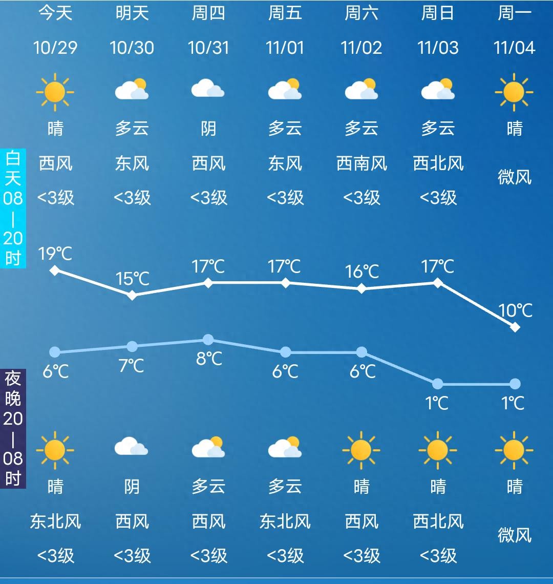 今天白天:晴,西风2到3级,最高气温19度。