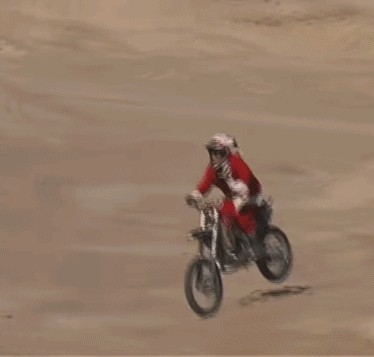 非常牛逼的圣诞老人,骑摩托车冲上垂直90度的小山坡