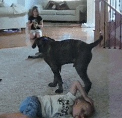 用屁股坐在宝宝脑袋上玩的黑狗