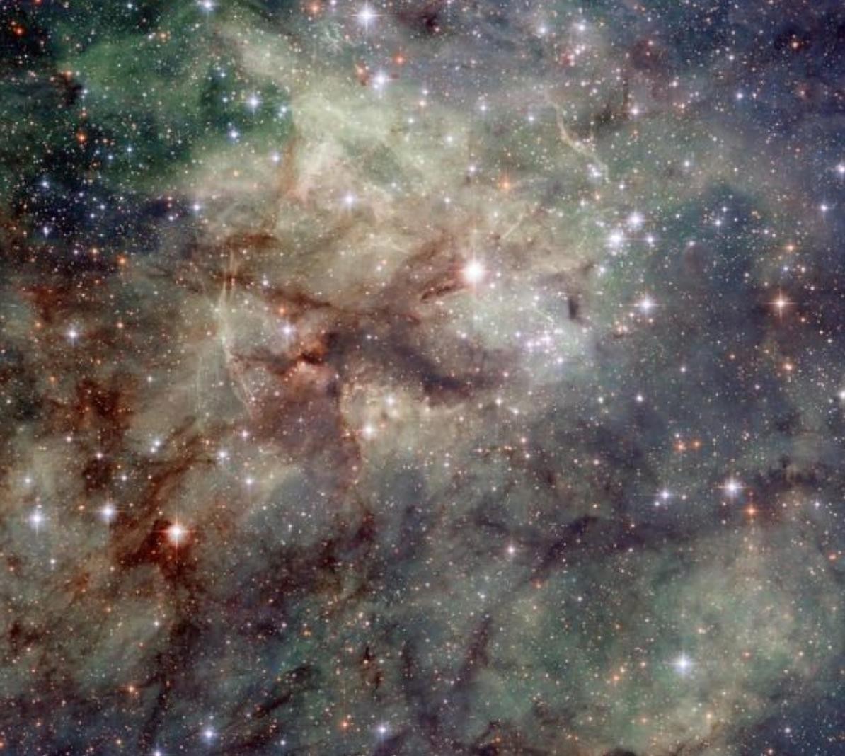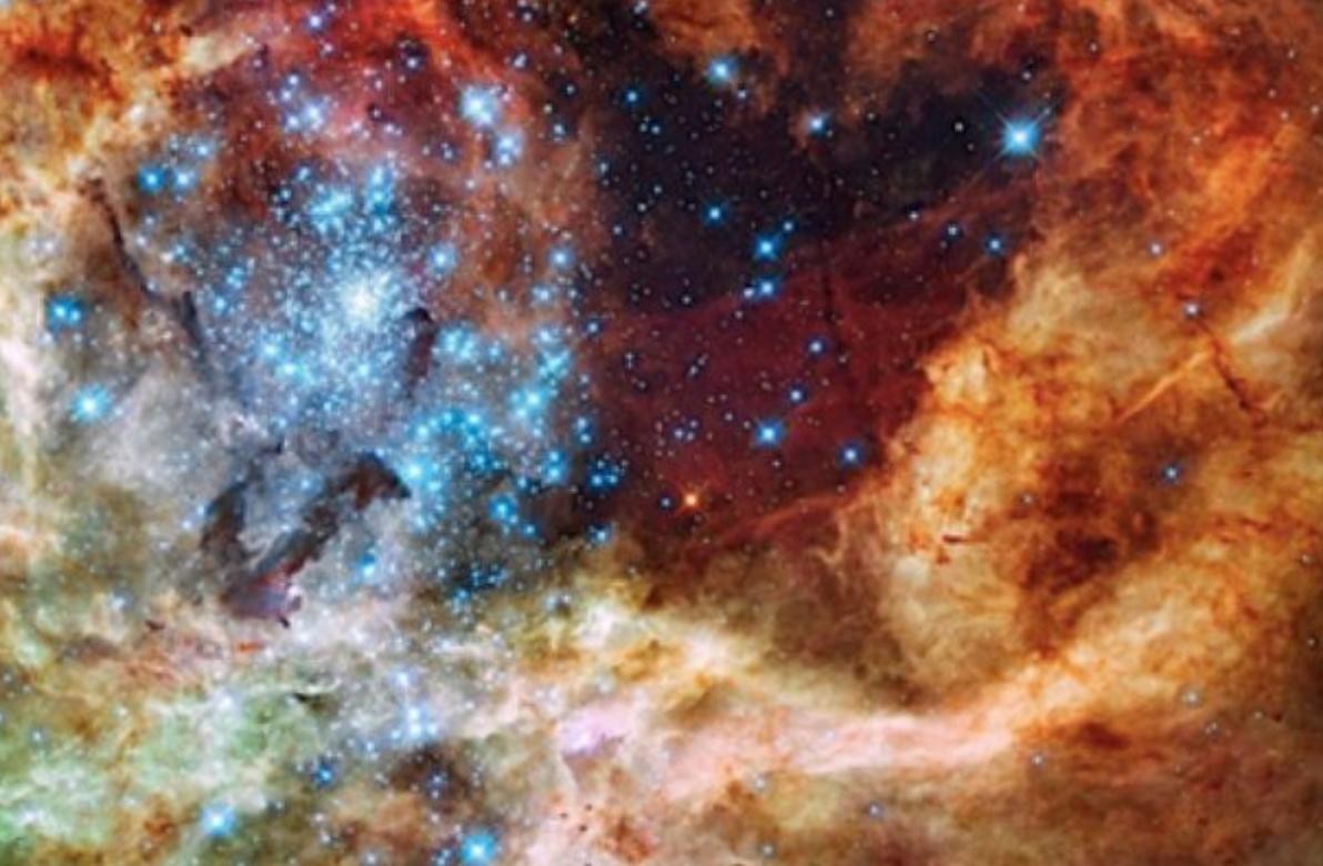 这张彩色图像显示了在我们的银河系附近的大麦哲伦星云的一个极不稳定的区域。你看到的红色气体是氢,绿色的是氧,蓝色的“钻石”实际上是宇宙中已知的最大的恒星,有好几颗比太阳大数百倍。
