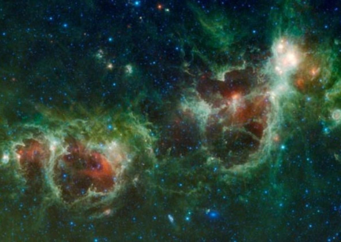 这张由广域红外探测器拍摄的红外照片显示了右边的心星云和左边的灵魂星云。上图距离地球约6000光年。
