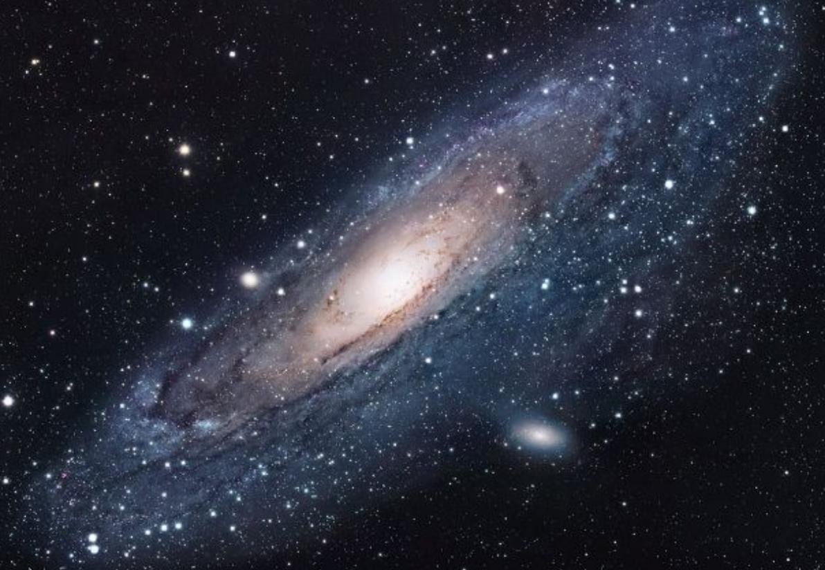 最近的星系邻居仙女座星系,它是银河系之外夜空中唯一肉眼可见的天体之一,跨度约20万光年。