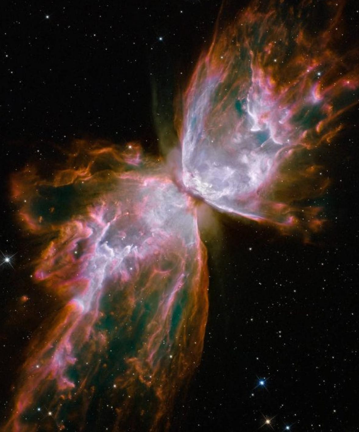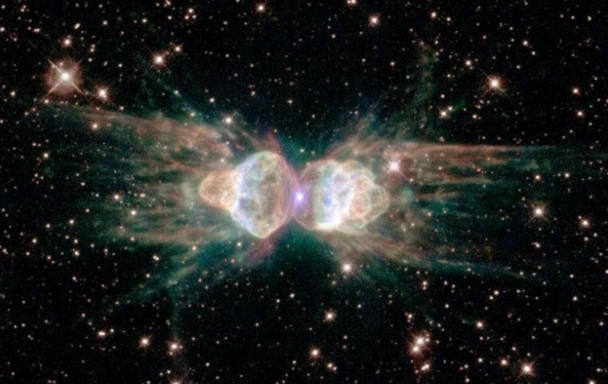 就像蚂蚁的身体一样,你看到的实际上是一颗正在消失的恒星。这些喷射到太空的气体实际上以每秒620英里的速度运动。不过别担心,这个星云距离地球大约8000光年(上图从左到右跨度约1光年)