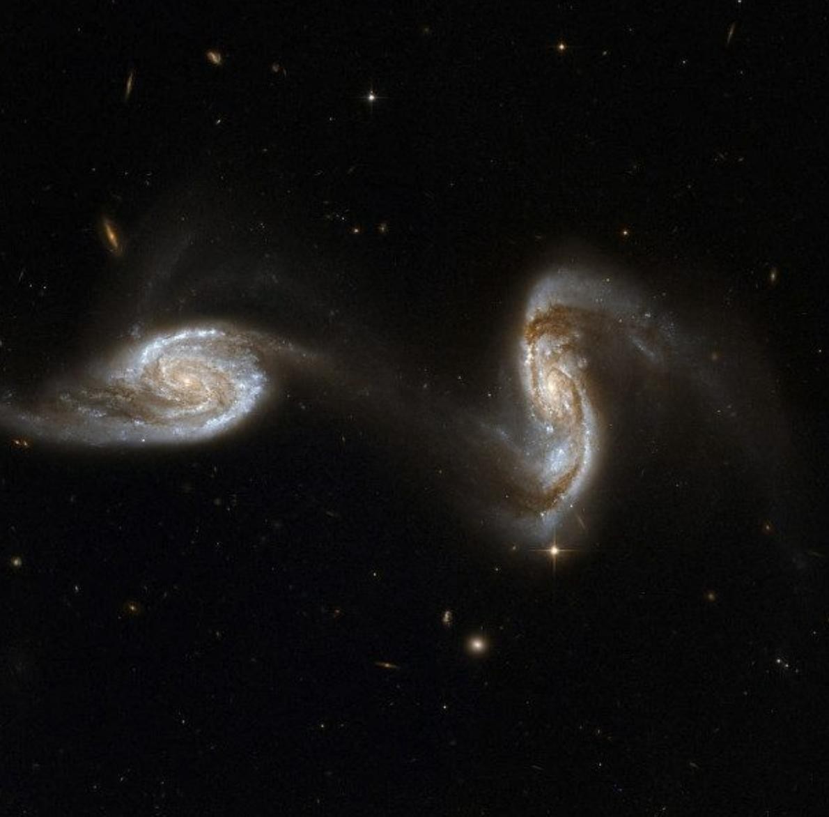 就像宇宙中的其他事物一样,星系也会相互碰撞。上面所捕获的两个星系最终将形成一个椭圆星系,但这一过程可能需要10亿年以上的时间。